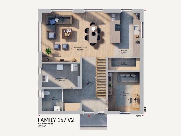 Ihr Familyhaus auf Bodenplatte oder Keller ist fast schlüsselfertig. Alle im Konfigurator ausgewählten Elemente werden Ihnen inklusive Heizungs-, Sanitär und Elektrotechnik fertig übergeben. Das Spachteln und Streichen der Innenwände sowie das Verlegen der restlichen Böden, die nicht im Konfigurator enthalten sind, übernehmen Sie selbst.
